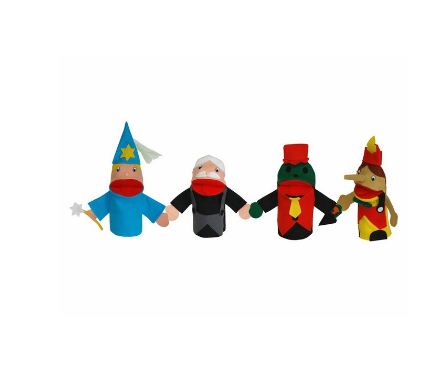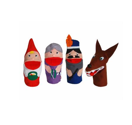 Contém 4 fantoches tamaho médio 30 x 15 x 0,5 cm em feltro antialérgico. Os olhos e nariz são afixado com trava interna