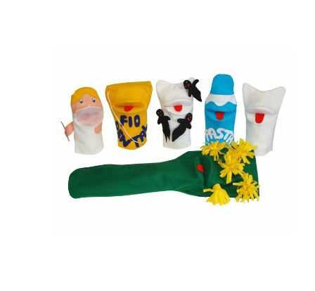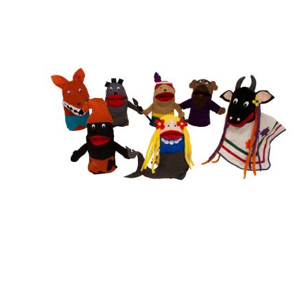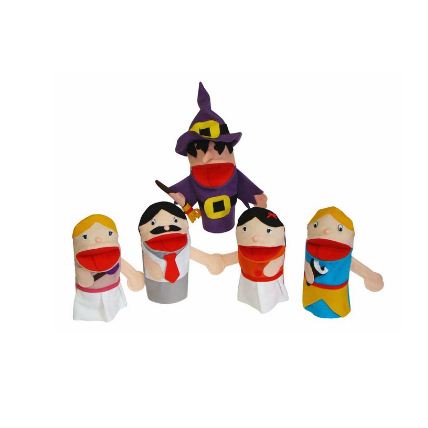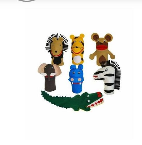 Contém 5 fantoches tamaho médio 30 x 15 x 0,5 cm em feltro antialérgico. Os olhos e nariz são afixado com trava interna