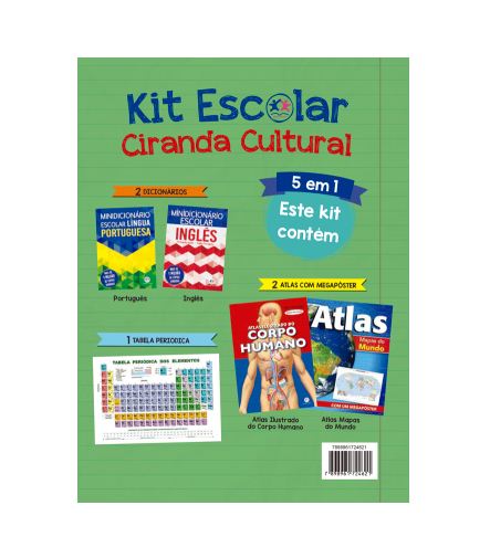 Kit composto por: ISBN: 9788538069126 Atlas - mapas do Mundo ISBN: 9788538007333 Atlas ilustrado do corpo humano ISBN: 9788538067245 Minidicionário escolar Língua Portuguesa (papel off-set) ISBN: 9788538073949 Minidicionário escolar Inglês (papel off-set) ISBN: 9788538060307 Tabela periódica