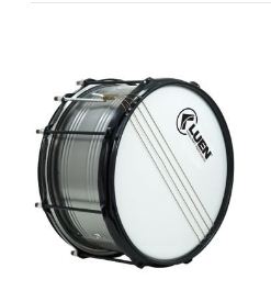 02- Um surdo-mor infantil, fuste em PVC, com pele em poliéster sintético, medindo aproximadamente 160x240 mm de diâmetro. Acompanham duas baquetas de