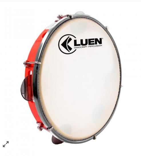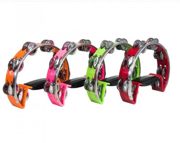 06- Um pandeiro confeccionado em PVC colorido, com aproximadamente 200 mm de diâmetro, com platinelas em metal cromado, pele fixa em poliéster sintético