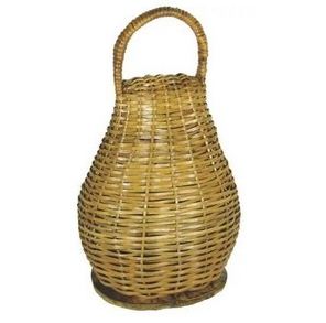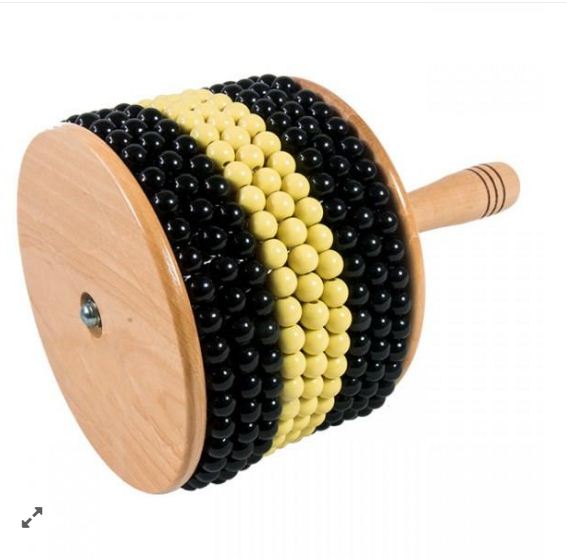 10- Uma maraca confeccionada em madeira, com corpo em material plástico, medindo aproximadamente 170 mm.