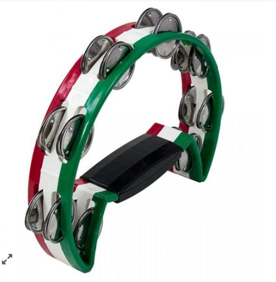 08- Um pandeiro pastoril confeccionado em PVC colorido, medindo aproximadamente 200 mm de diâmetro, com platinelas em metal cromado.